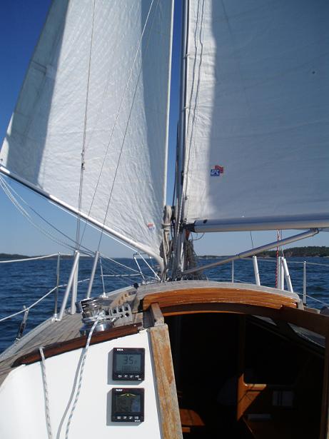 Rullattava genaakkeri Aivan pintatuulilla, sitten kun fokan veto alkaa hiipumaan, keulalle laitetaan genaakkeri. Päädyin ensi vaiheessa Doylen UPS-purjeeseen. 65 neliön purje antaa mukavasti lisäpinta-alaa kevyen kelin purjehdukseen ja myös nousee kohtuullisen ylös. Aivan platlenssilla se genaakkerien tapaan vaatii 'hoivaamista'. Kun rullan köysiluuppi on vedetty valmiiksi paikalleen, purje rullineen on aika helppo laittaa paikalleen ja nostaa. Avaaminen tehdään sitloorasta, mikä on etu yksin liikkuessa. Legin lopussa sen voi rullata kiinni, laskea ja pakata taas pois tieltä kaidevaijeriin kiinnitettyyn kassiinsa. Rullalla ylhäällä sitä sen sijaan ei voi säilyttää laiturissa tai pidemmillä vastatuuliosuuksilla kun fokka otetaan käyttöön, koska tällä rullatulla purjemakkaralla on taipumus purkautua yläpäästään lepattamaan ikävästi tuulessa. Ratkaisu voisi olla vaihtaa purjeelle 'top-down' -rulla. Rullaksi valitsin aikanaan Facnorin genaakkeri-rullan, koska siinä voi rullausköyden asettaa lennossa rullalle ja irti. Muutamassa muussa mallissa rullausköysi on pysyvästi pujotettuna rullassa, mikä olisi hieman hankalampaa.