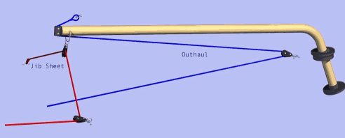 Hoyt-puomissa on kaksi säätöä: skuutti ('sheet'), jolla säädellään purjeen kulmaa, sekä alaliikin /skuuttikulmaan kiristys ('outhaul'), jolla säädetään purjeen muotoa. Keulapurjeena puomilla käytin ensin G3-genuaa vähän muokattuna. Seuraavaksi kesäksi sain mittoihin leikatun fokan, joka täyttää keulakolmion paremmin, ei kuitenkaan likikään niin hyvin kuin normaali kryssifokka. Puomi jalustetaan toiselle genua-vinssille ruorimiehen saataville. Jaluksen ja liikinsäädön köysien reitit menevät nyt keulakannen keskellä. Puomin kääntymiskulman ansiosta ei kaidevaijereita tarvinnut siirrellä. Wasa 55:n pitkähköä keulapulpiittia hieman lyhensin takaosastaan.