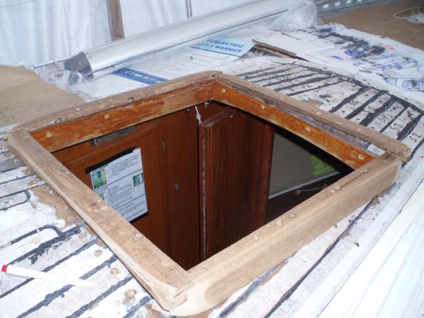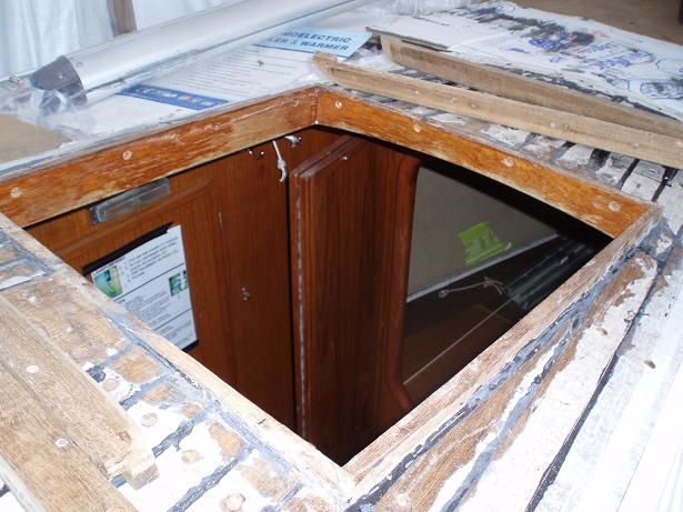 30 v. vanha keulan kansiluukku oli ränstynyt, yksi korvake rikki ja lasi/pleksi säröillä. Tiikkikannen remontin yhteydessä jouduin irrottamaan sen asennuskehikoineen, joten päätin uusia luukun saman tien. Wasa 55:ssa keulaluukku on istutettu tiikkilankusta (noin 2x2”) kannelle tehdyn sokkelikehikon päällä. Kehikon sisäpuolella on tiikistä tehty 10 mm kehys. Alkuperästä luukkua ei enää taideta valmistaa. Valinta päätyi Lewmarin Ocean-luukkuun, josta cruising-porukka puhuu myönteisesti. Sopivin koko oli #60. Kannen tiikkirimoja irrotellessa jouduin ottamaan myös sokkelikehikon irti. Tiikissä 30 v. istuneet ruuvit olivat aika tiukassa. Sokkelia takaisin laittaessa jouduin sitten muokkaamaan sitä, jotta se istui hyvin uusien ohuempien kansirimojen päälle ja sopi hieman erimuotoiseen luukkuun. Amatööri-puusepän jäljiltä tiivistämiseen meni tuubillinen Sikaflexia... Uuden luukun tilasin ns. kauluksettomalla asennuslaipalla. Siinä kiinnityspinta kantta vastaan on sileä, mutta laippa ei ole erityisen vääntöjäykkä eli luukku vaatii tasaisen tukevan kiinnitysalustan. Nykyisellä kokemuksella ottaisin normaalin kauluksellisen laippamallin ja jyrsisin kaulukselle asennuskehikkoon sopivan uran: näin luukun kehys olisi tukevampi ja tiivistysmassalle enemmän tilaa. Kaulukselliseen versioon saa myös helpommin lisukkeita kuten pimennysverhon tai hyttysverkon. Vanha luukku oli kiinnitetty asennussokkeliin puuruuveilla. Uuden kiinnitykseen käytin kannen läpi meneviä 6 ja 8mm hk-koneruuveja. Niiden mutterit jäivät näkyviin sisäpuolen kattoon, missä ne pitää jotenkin suojata. Uusi luukku on nyt hyvän näköinen, helppo käyttää ja tiiviskin.